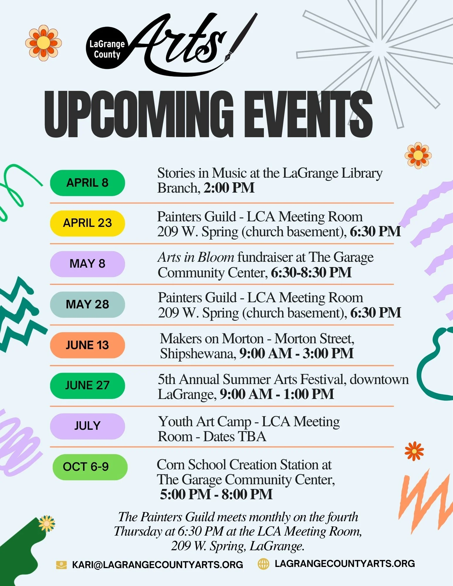 Founded in 2022, LaGrange County Arts is a 501(c)(3) nonprofit organization dedicated to bringing art-centered experiences to our residents. There are several ways to get involved by volunteering your time, donating to the cause, or submitting your work as an artist.